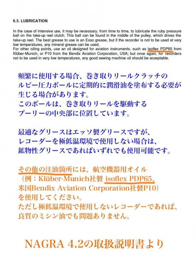 NAGRA 4.2のサービスマニュアルには、常温での使用だけなら通常の鉱物油でOKですが、極低温での使用時にはPDP65を使うよう指定があります。当方としては迷わずこのPDP65の使用をお勧めします。他の機種はまだ確認できていませんが別の潤滑油を指定しているかもしれません。たとえばNAGRA T-AUDIOはもう一ランク粘度の低いPDP38が指定してありました。ご自身でお使いになる機種をご確認の上落札してください